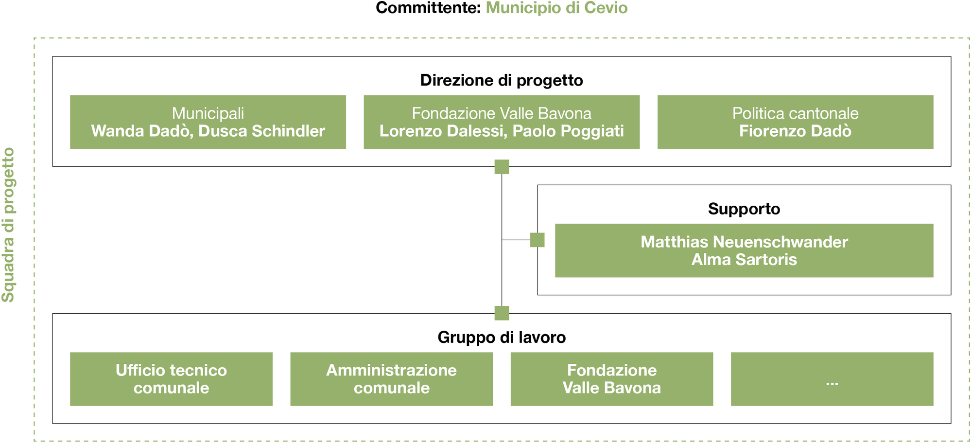 Il Municipio di Cevio ha attivato nel dicembre 2024 una Governance di progetto, nella cui Direzione figurano due rappresentanti del Comune di Cevio, due della Fondazione Valle Bavona e un rappresentante della politica cantonale.